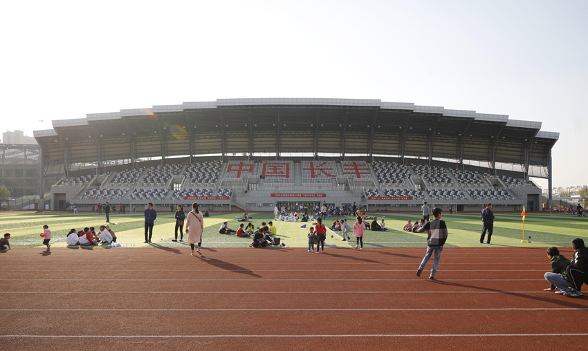 长丰县体育公园占地166.05亩。公园内总共规划了三个场馆:体育场、体育馆和综合馆。其中,体育场已竣工并投入使用,体育馆和综合馆在建。体育场规划为乙级体育场,用于举办地区性和全国单项比赛。建筑面积6886.45平方米,总座位数4000座(含10个无障碍坐席、78个贵宾席位),体育场可进行大型田径运动、足球等体育比赛活动。周边布置健身步道、配套停车场以及广场绿化景观等。体育场坐落于体育公园东北角,是体育公园的重要核心,凭借巨大的体量成为景观焦点。流线型的钢结构顶棚从远处望去,展示了体育场独特的轮廓线,既丰富了城市天际线又融入了体育公园的环境中。与吴山路东侧的新城公园一起成为吴山路的重要城市节点。同时,与体育馆、综合馆、新城公园形成聚集效应,带动整个文化体育功能区的发展。体育场看台为巨大的钢结构悬挑,结构处理复杂:下部采用现浇钢筋混凝土框架结构,上部采用钢管桁架结构体系。由于平面的不规则性或平面超长,在±0.000以上设置防震缝(兼伸缩缝)。上部管桁结构靠结构抵抗温度作用,考虑±30度温差,合拢温度15-25度。